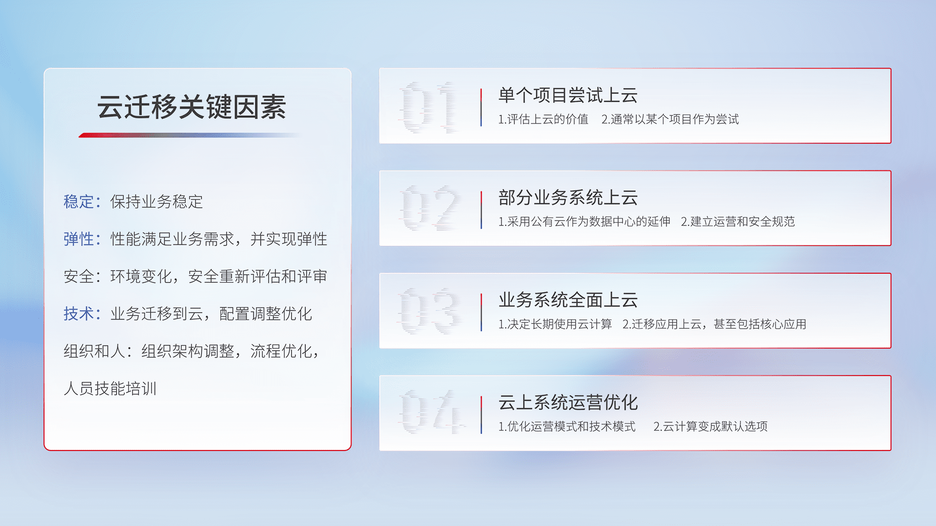 结合实际业务,,,,从规划设计、、云平台选型、、、云原生改造、、、、数据迁移、、、集成交付,,迁移全过程为客户识别最佳上云路径,,做好风险识别管理,,,,设计网络架构、、、身份权限、、、安全审计合规、、、操作审计、、日志审计、、、监控告警策略、、、多站点容灾设计等,,,对云上基础设施进行整体规划,,,,提升IT治理水平,,,以满足弹性、、、、高可用、、、、高性能的需求。。。