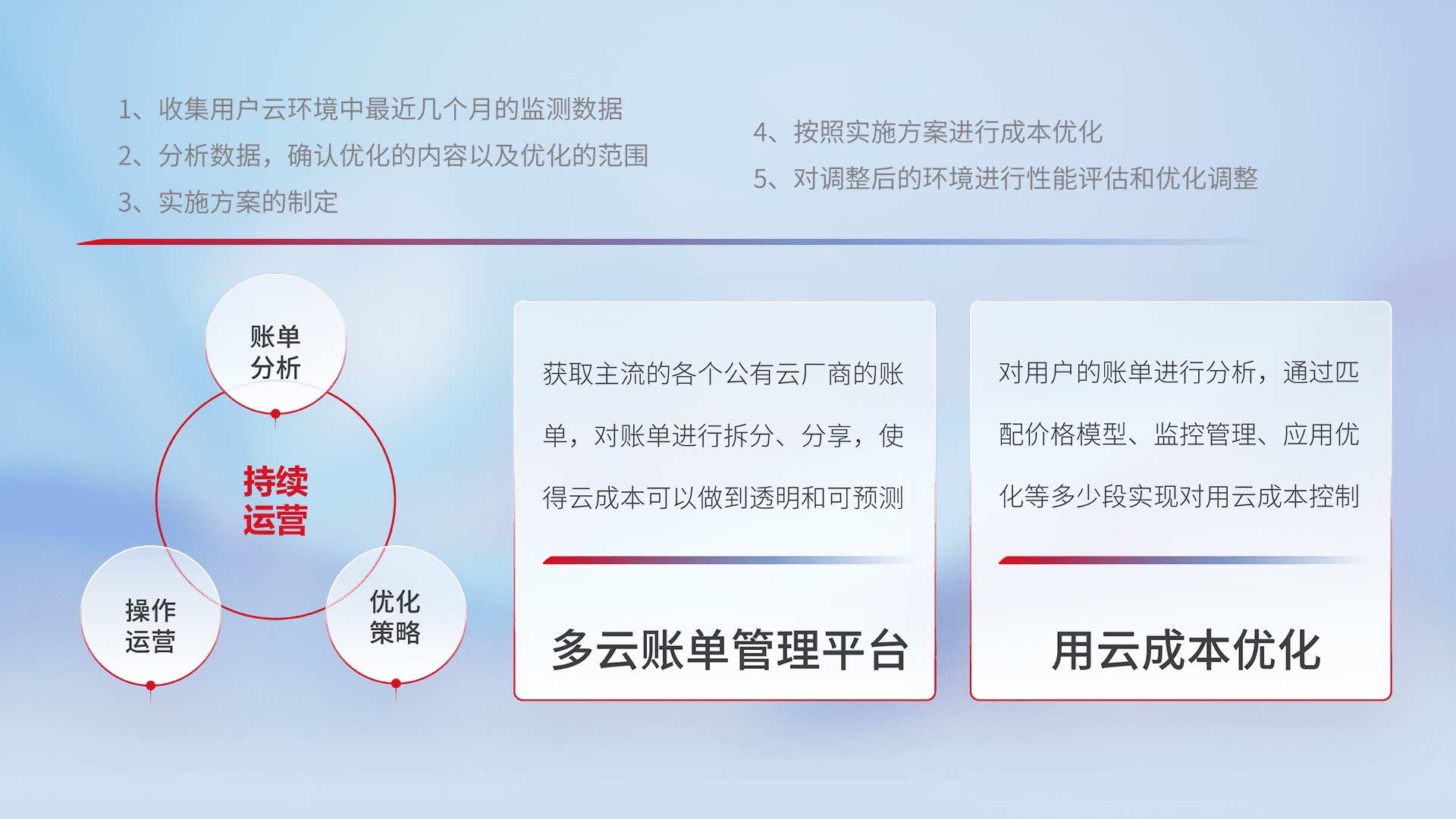 通过多云纳管,,,以统一的资源数据模型把客户的云资源进行抽象和封装,,,进而实现对多云资源的统一操作,,,,保障云资源管理的可靠性、、、、稳定性与可用性。。量身定制化运维内容,,,配置、、开发运维、、补丁管理、、备份、、、、监控、、认证和访问管理、、审计和日常巡检等,,,,保障在用云过程中的可靠度,,,稳定度以及高可用率。。